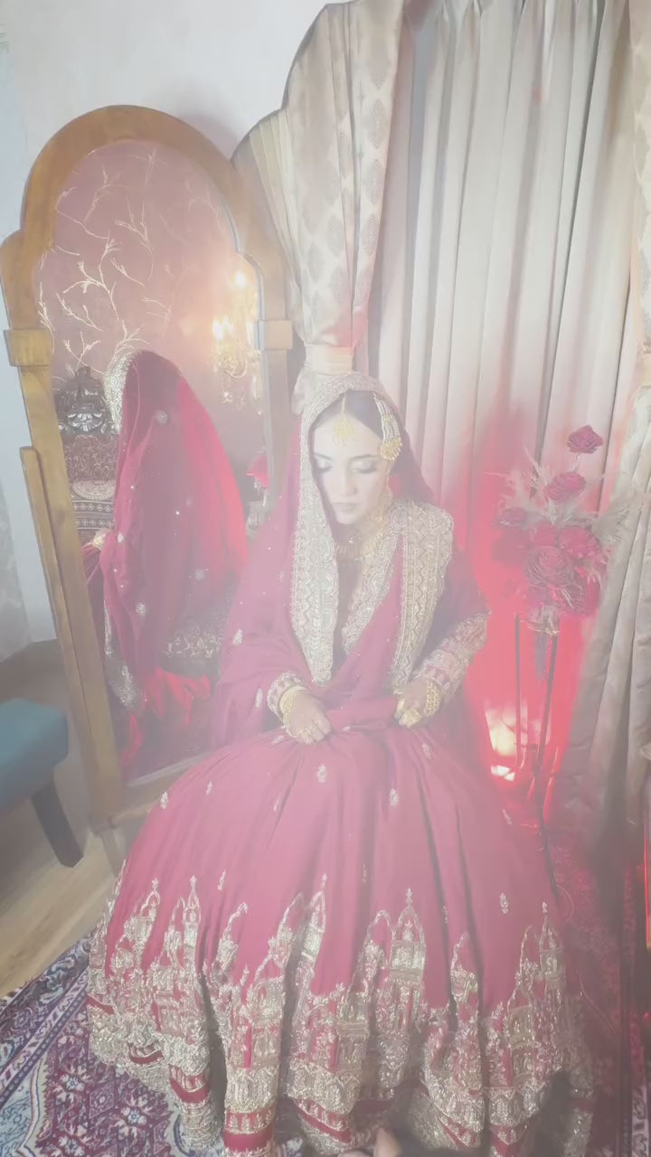 Coordinating Dupatta: A lightweight, sheer dupatta in a matching maroon hue features silver and gold embroidery along the edges and borders, adding elegance and flow to the outfit.